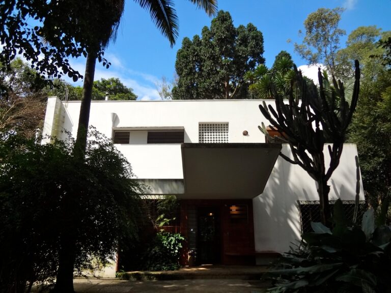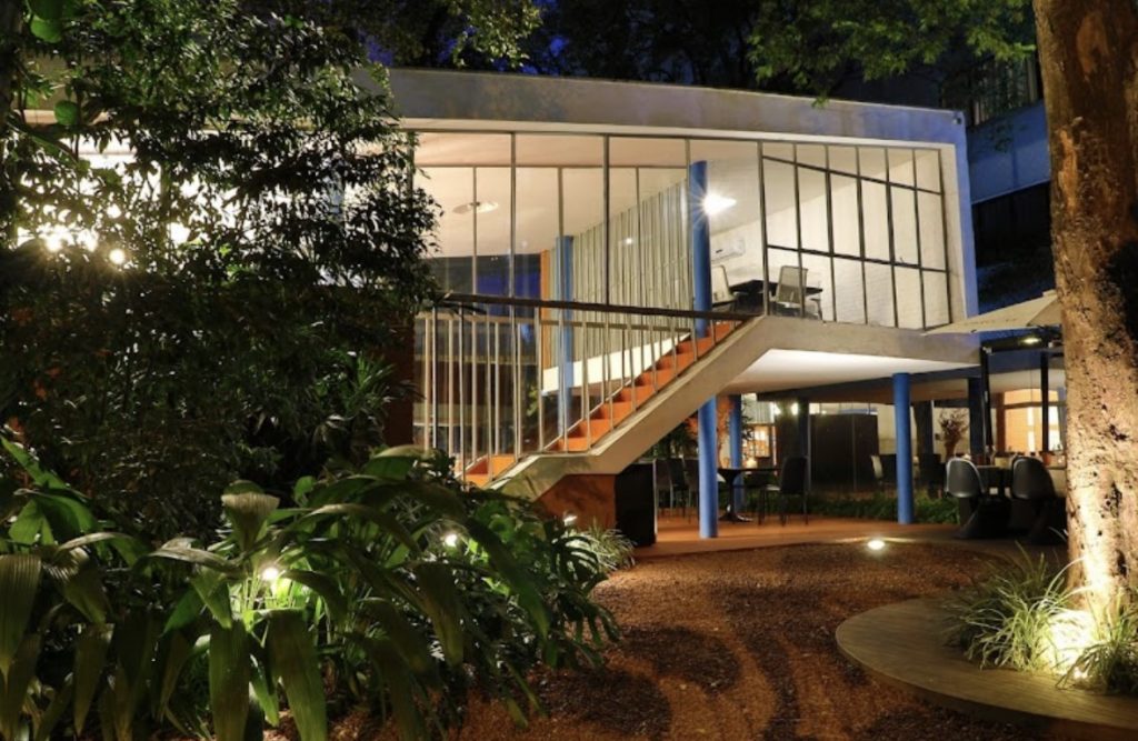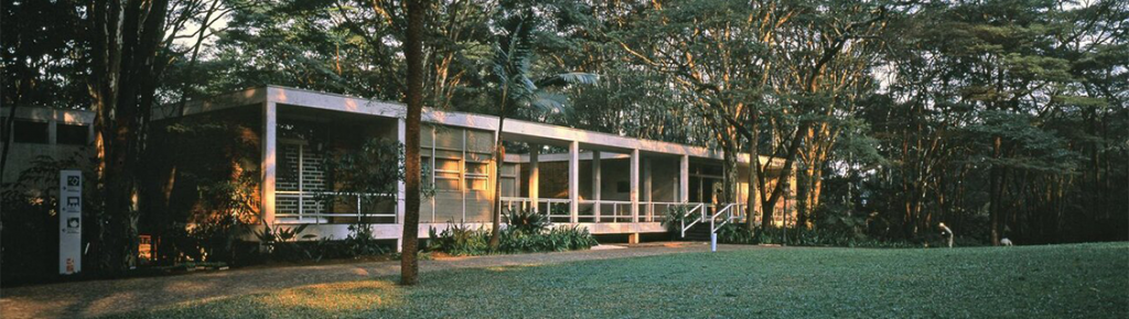 Projeto da italiana Lina Bo Bardi de 1951, a Casa de Vidro é a primeira construção da arquiteta no país. A residência traduz o desejo de abrir a casa para o entorno e fazer com que as construções sejam permeáveis e conectadas com a paisagem. Localizada no Morumbi, a casa se destaca por sua estrutura elevada em pilotis – ou colunas – na parte frontal, que a faz “flutuar” sobre a encosta, e pelas grandes superfícies de vidro que buscam uma conexão entre interior e natureza. O jardim cresce embaixo da casa promovendo a integração com a paisagem, tão cara ao movimento.