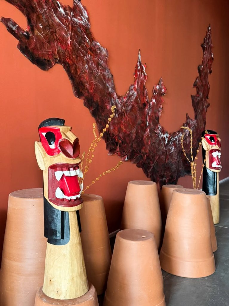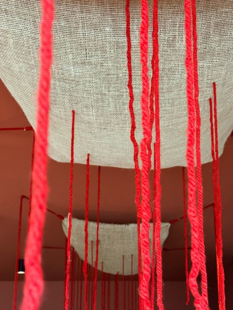 Na entrada do Pavilhão Brasil, ainda dentro do Pátio Metrópole, o restaurante BIOMAS é assinado por Celso Rayol e a Cité Arquitetura, com mobiliário de Del Sanchez e patrocínio da Breton. O fio condutor é, nas palavras do arquiteto, “os rios, o fluxo da vida.” No salão da Amazônia, iluminação que imita a copa das árvores, cestaria indígena e cerâmicas evocativas das datações arqueológicas da floresta compõem o ambiente. Entre os elementos do espaço, uma instalação central remete aos rios voadores — fenômeno em que a evaporação é tão densa que o rio parece flutuar no ar. No salão da Caatinga, por sua vez, tons de vermelho-terra traduzem o que Rayol descreve como visceral: “o sangue que corre nas veias”, o fluxo do Velho Chico, materializado em nuvens de juta e fios vermelhos que descem como chuva.